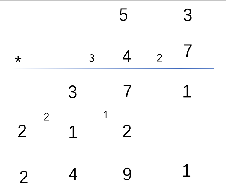 3、模拟乘法竖式,枚举两个乘数的每一位分别相乘,将结果统计到积的对应位。