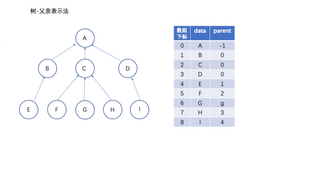 原理:利用一维数组来表示树,一维数组的每个元素表示树的结点,其中包括结点的数据和该结点 的双亲在数组中的下标;数组中的第一个元 素表示根结点,该结点无双亲,因此parent域用-1表示,其他结点按照层序存储.如结点B、 C、D 的双亲结点是下标为0的根结点,其parent域用0表示。