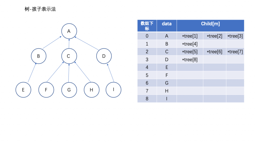 孩子表示法存储普通树采用的是 “顺序表+链表/数组” 的组合结构,其存储过程是:从树的根节点开始,使用顺序表依次存储树中各个节点,需要注意的是,与双亲表示法不同,孩子表示法会给各个节点配备一个链表或指针数组,用于存储各节点的孩子节点位于顺序表中的位置。